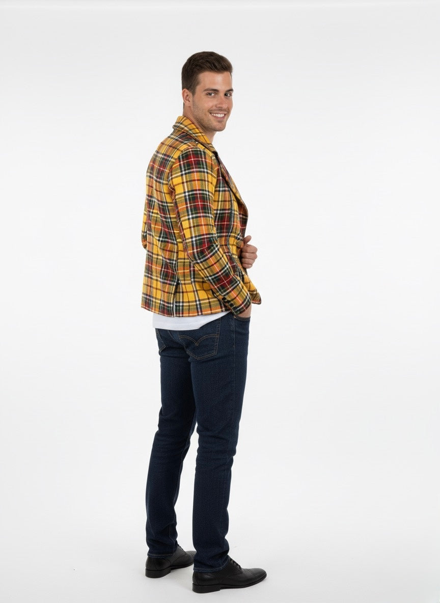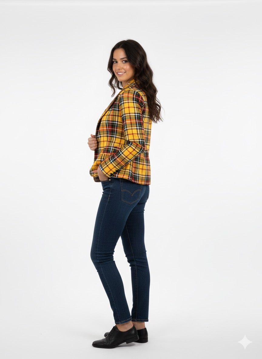 * Estampado Impactante: Presenta un vibrante patrón tartán (escocés) donde el amarillo intenso es el color dominante, contrastado con líneas en rojo, azul marino, verde oscuro y detalles en blanco. Un verdadero 'statement piece'.