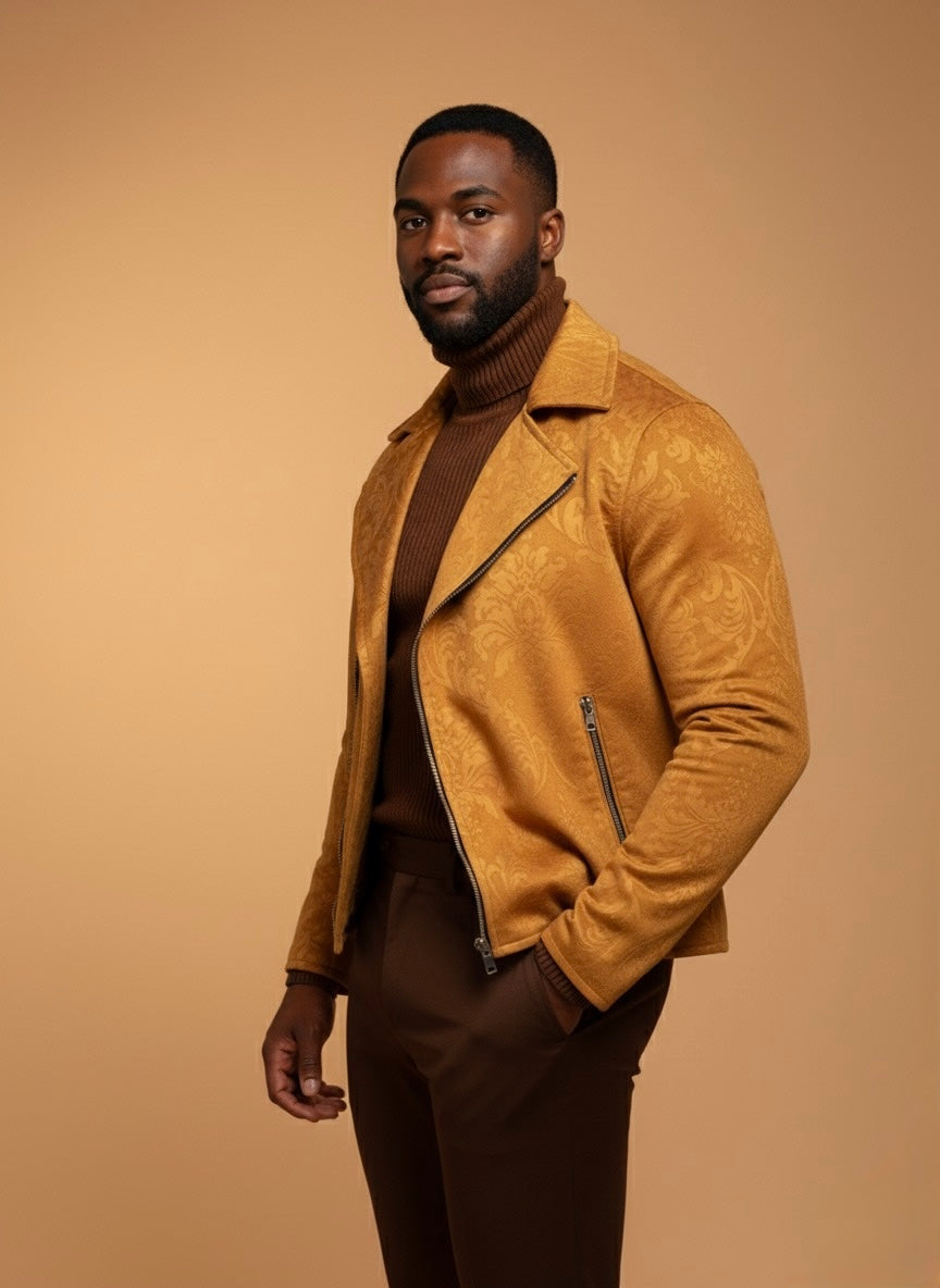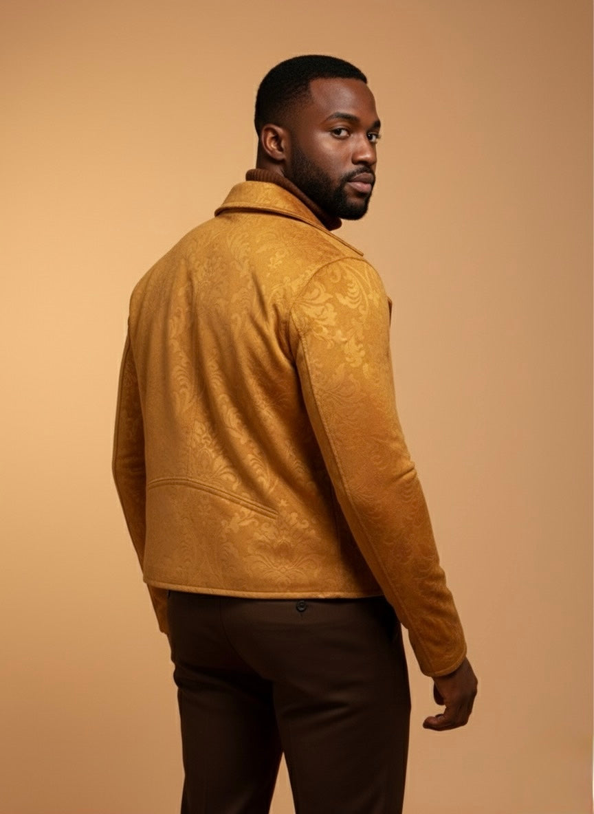* Terciopelo Estampado Exclusivo: Confeccionada en terciopelo, esta chaqueta destaca por su textura rica y un sutil estampado que le confiere una originalidad inigualable. La suavidad al tacto es tan envolvente como su diseño.